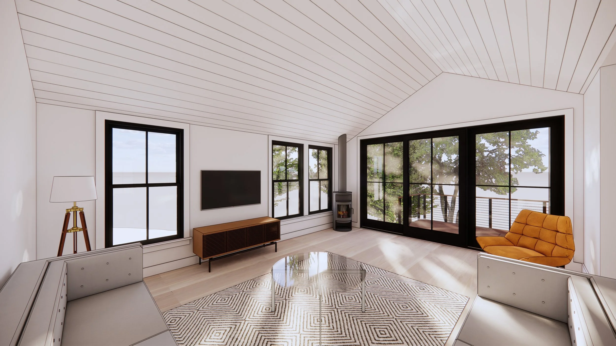East Shore Addition expands a coastal home on Great Island in Narragansett, Rhode Island, overlooking Bluff Hill Cove along the shores of Point Judith Salt Pond. Designed to support summer living, the addition introduces new bedrooms and an enlarged living room for a growing family. An expansive sliding door opens the space to the west, framing sunset views and extending daily life onto the seaside deck.